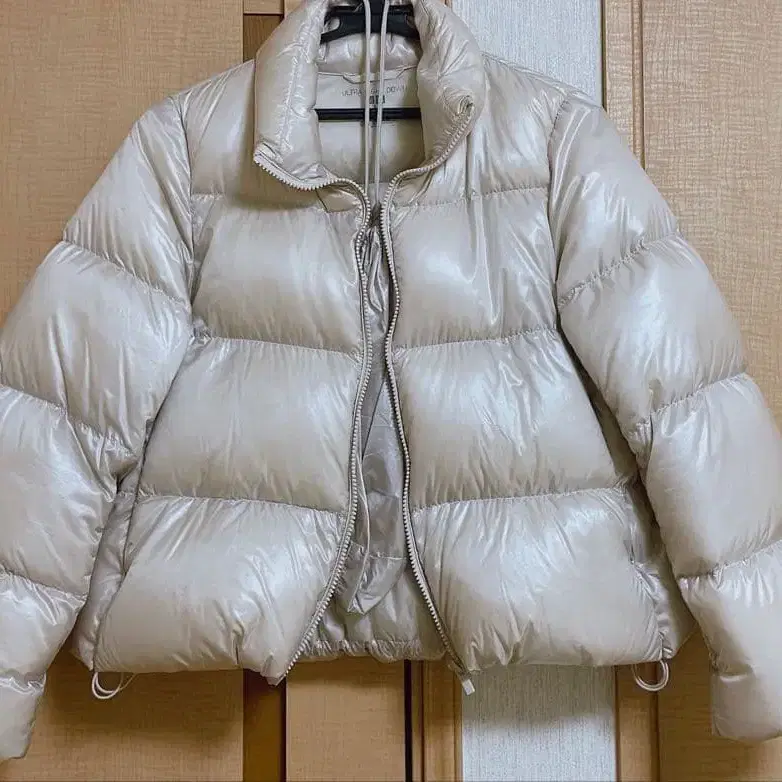 유니클로의 광택 있는 베이지 색상 숏 다운 자켓입니다.