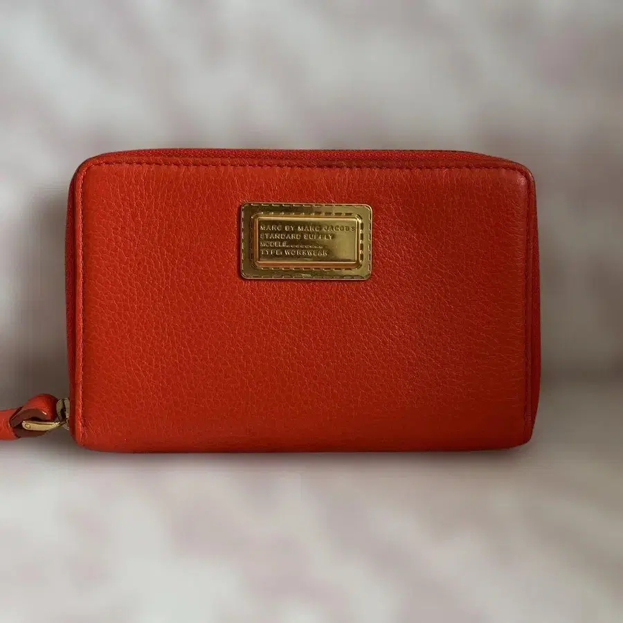 오렌지색 가죽 소재의 라운드 지퍼 장지갑, 스트랩이 있어 사용하기 편리한 디자인.