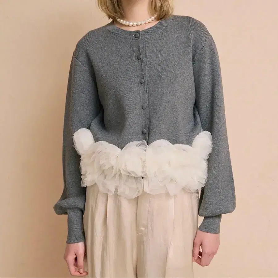 밑단에 풍성하게 더한 튤 페플럼이 화려한 악센트를 더하는 니트 가디건. 봉긋하고 입체적인 튤이 허리 라인을 아름답게 돋보이게 하여, 페미닌하면서도 세련된 인상을 줍니다. 컴팩트한 바디와 볼륨감 있는 소매의 밸런스가 절묘하여, 겉옷으로도 상의로도 입기 좋은 디자인입니다. 싸개 버튼이 은은하게 클래시컬한 무드를 더합니다.