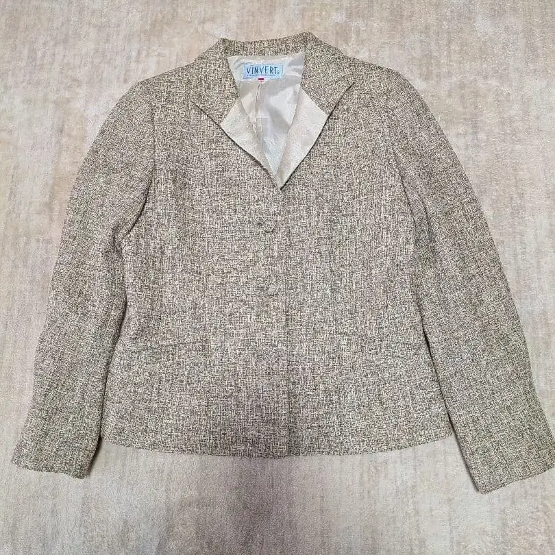 베이지 계열의 트위드풍 테일러드 자켓, 3개 버튼 디자인으로 세련된 인상.