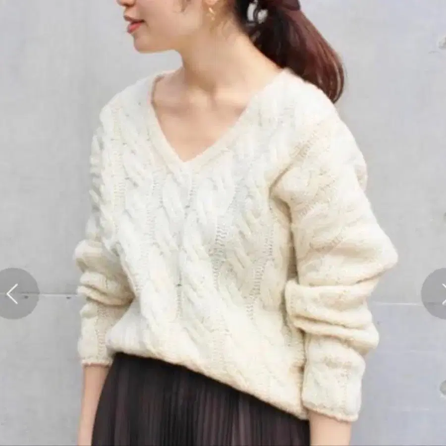 깔끔하게 파인 V넥과 입체적인 케이블 짜임으로 여성스러운 내추럴함과 따뜻한 표정을 연출합니다.