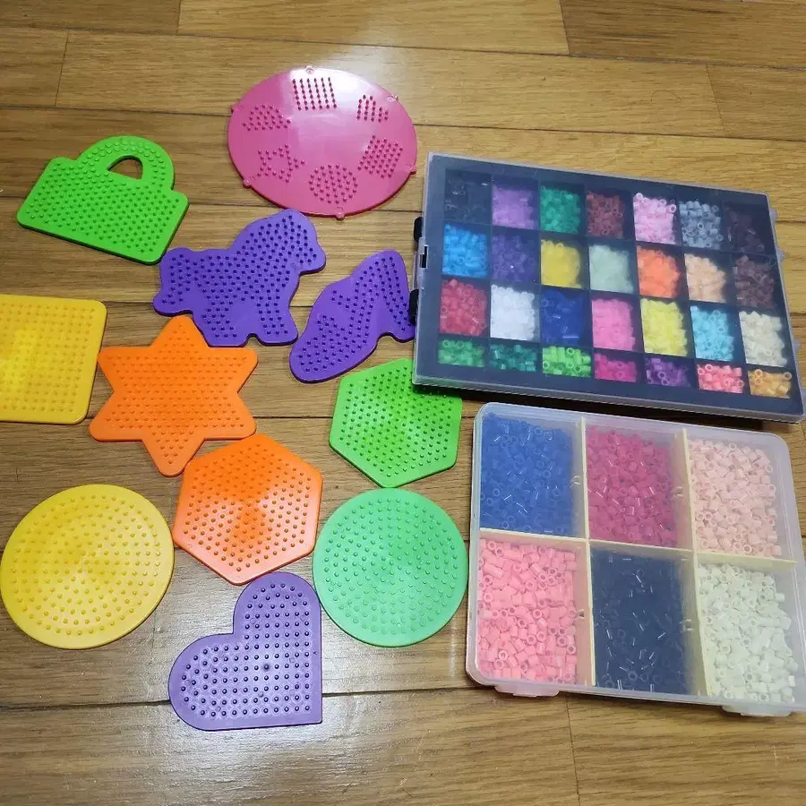 자동 번역되었어요. 원문보기다양한 모양의 펄러비즈 플레이트와 컬러풀한 비즈가 세트로 구성된 완구입니다.