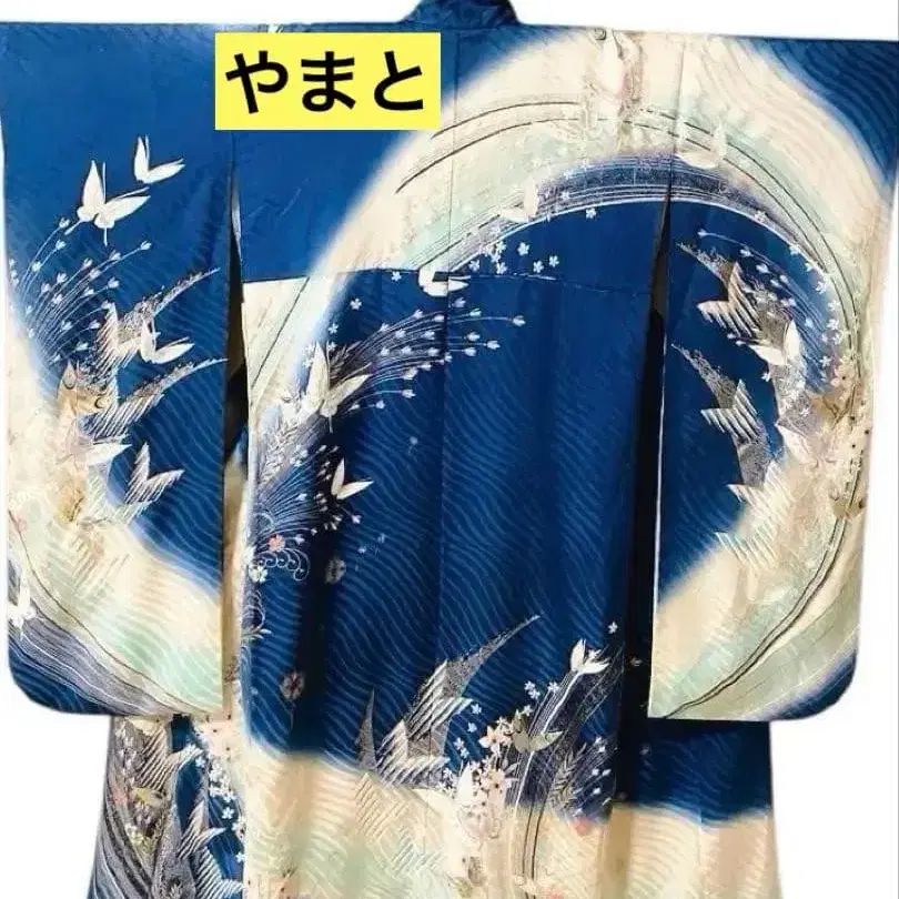 파란색과 골드 컬러의 아름다운 무늬가 특징인 후리소데