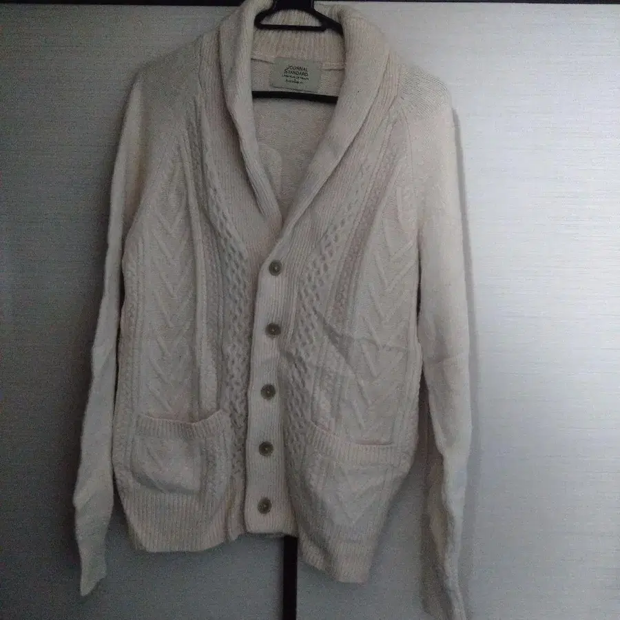 자동 번역되었어요. 원문보기아이보리 색상의 케이블 니트 가디건, 숄카라와 앞면 포켓 부착.