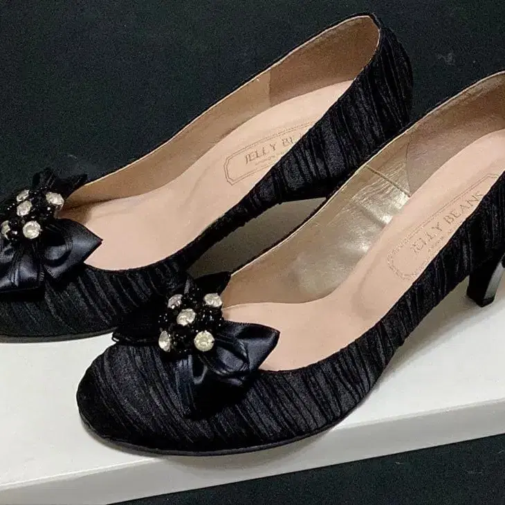 리본과 비쥬가 화려한 블랙 펌프스.