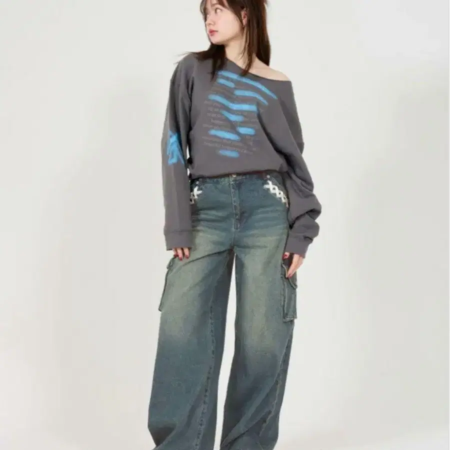 밈 셀렉 허리 접힘 빈티지 블리치 카고 데님 팬츠