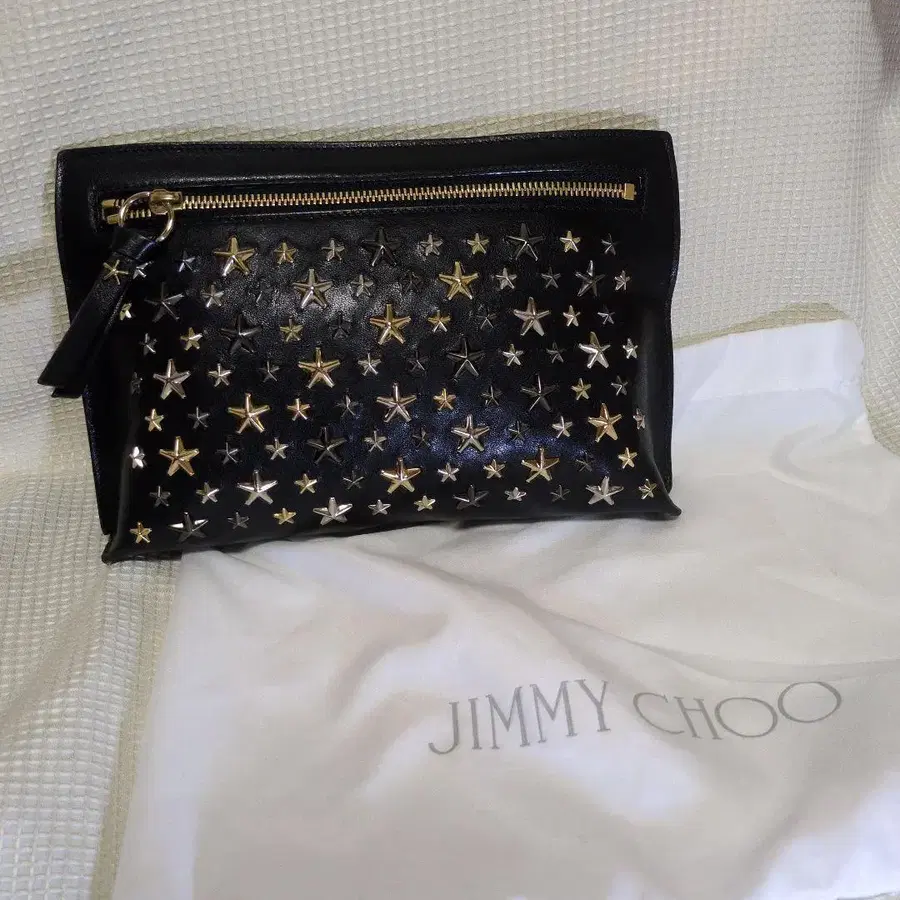 별 모양 장식이 들어간 블랙 가죽 클러치백. - 브랜드: JIMMY CHOO - 색상: 블랙 - 디자인: 별 모양 장식 - 소재: 가죽 - 지퍼: 골드색 - 부속품: 수납 가방 사이즈 가로 25 세로 16, 바닥 5cm 정도 남성분들도 들면 귀여울지도 모릅니다. 사용 횟수 2회 정도로 적습니다. 뒷면에 약간 긁힌 자국이 희미하게 있습니다. 잘 부탁드립니다.