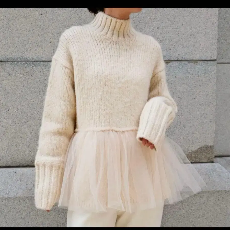 곧 완판된 안민우의 니트입니다. 크림색 니트 스웨터에 튤이 달린 디자인입니다. - 색상: 크림색 - 소재: 니트, 튤 - 디자인: 하이넥, 튤 장식 - 소매: 긴팔 - 스타일: 캐주얼 방문해 주셔서 감사합니다.