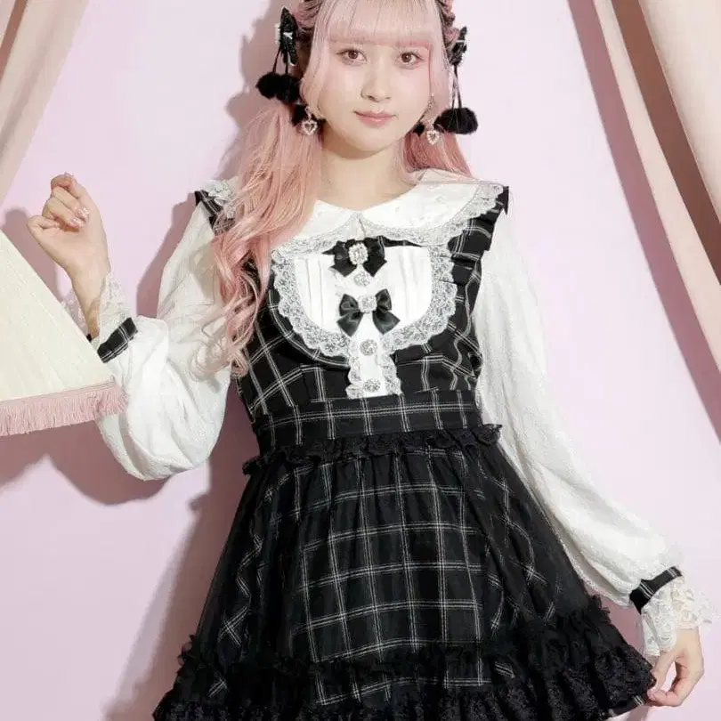 걸리시 셋업 원피스 리본 포함 양산형 지뢰계 핑크 x 블랙