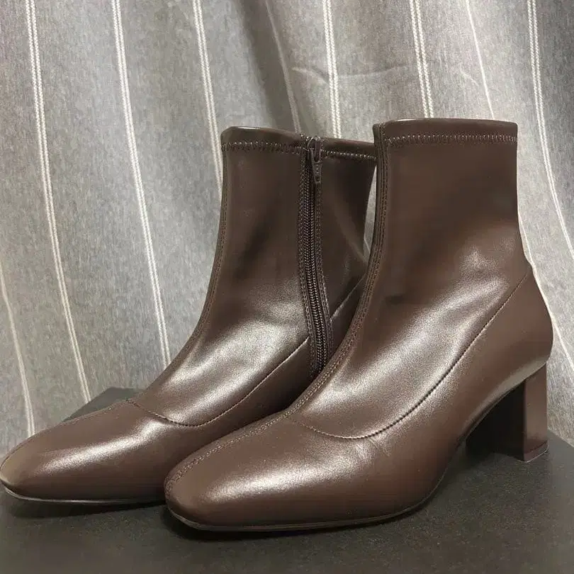 지퍼 달린 브라운 숏부츠, 합성 피혁 소재의 중간 굽 디자인.