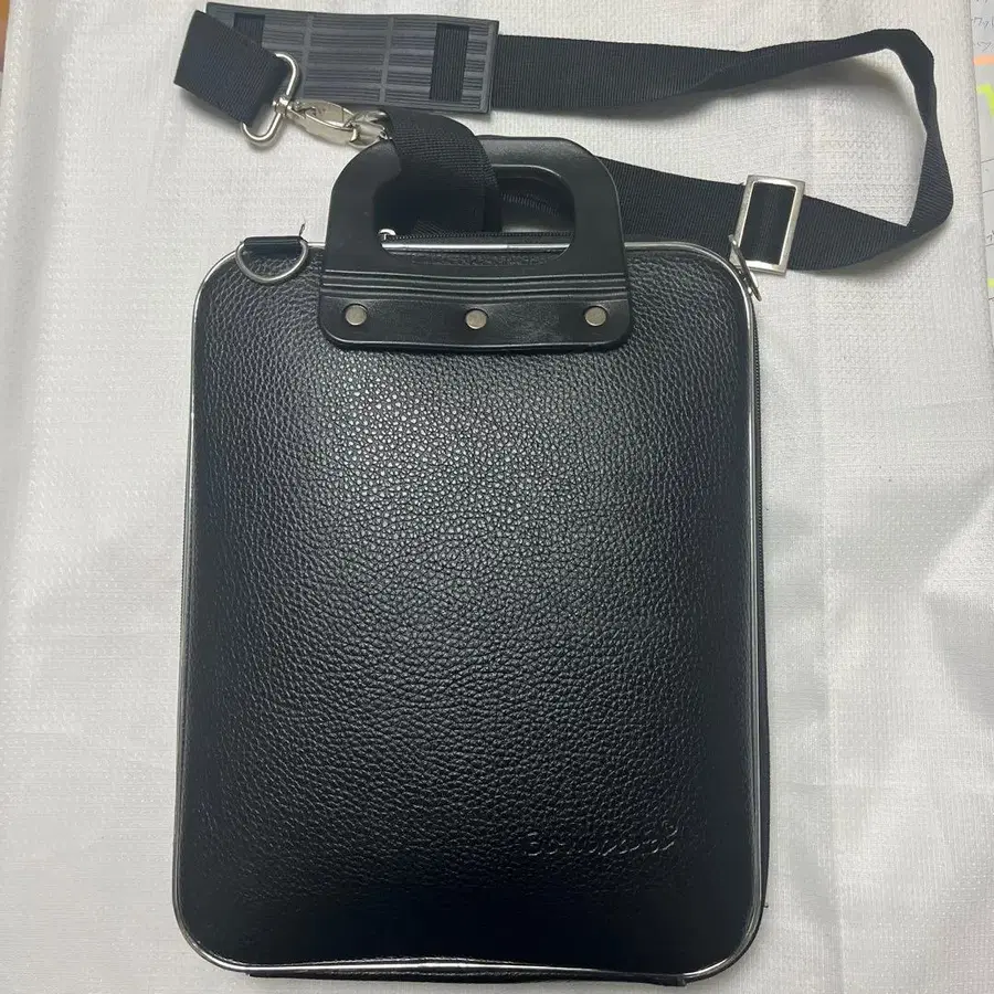 합성 피혁 소재의 블랙 숄더백, 핸들이 있어 스타일리시합니다.
