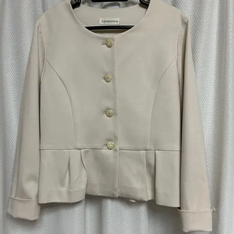 방문해 주셔서 감사합니다. 아이보리 색상의 노카라 자켓으로, 플레어 디자인과 장식 버튼이 특징입니다. 스트레치 소재로 착용감이 좋습니다. 시착만 한 상품입니다. - 브랜드: HARMONICA - 스타일: 노카라 자켓 - 디자인: 플레어 디자인 - 포켓 없음, 안감 있음 총장 51, 가슴 너비 47cm