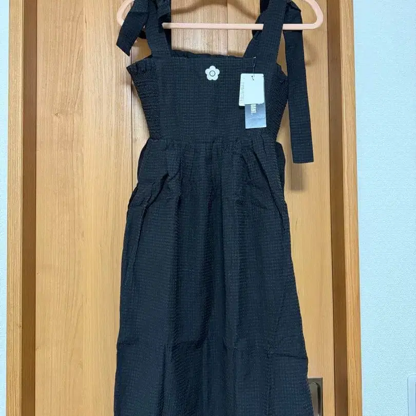 어깨끈을 원하는 위치에서 묶어 기장을 조절할 수 있는 사양의 원피스입니다. 가슴 부분에는 데이지 자수가 있어 귀엽습니다.