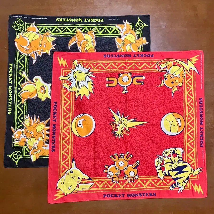 초기 90년대 포켓몬스터 반다나 손수건 런치 크로스 전기 타입과 땅 타입 2장 세트로 색상: 레드 블랙 소재: 면 100% 사이즈: 약 50x49cm 피카츄 라이츄 에레브 썬더 썬더볼트 코일 레어코일 찌리리공 탕구리 장기 자택 보관품에 대한 이해 부탁드립니다.
