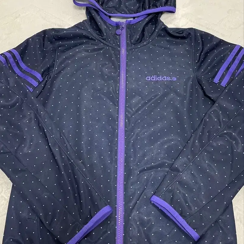 후드 부착 네이비 도트 무늬 자켓, adidas 로고 포함. - 브랜드: adidas - 색상: 네이비/퍼플 - 디자인: 도트 무늬 - 특징: 후드 부착, 지퍼 부착, 포켓 있음 - 로고: adidas 로고 (퍼플) 방문해 주셔서 감사합니다.