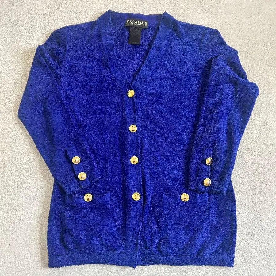 플리스 소재의 파란색 ESCADA 가디건, 골드 컬러 버튼 포함. - 브랜드: ESCADA - 색상: 파랑 - 스타일: 가디건 - 소재: 플리스 폴리에스테르 - 버튼: 골드 컬러 버튼 - 사이즈: 36 방문해 주셔서 감사합니다. 사이즈 - M