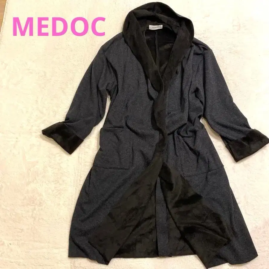 MEDOC의 롱 코트입니다. 코트라고 하기에는 얇을 정도로 부드럽고 가벼운 원단입니다. 속기모 처리가 되어 있습니다. 색상은 차콜 그레이이며, 안감은 블랙입니다. 오픈 프론트로, 코트보다는 롱 가디건에 더 가깝다고 할 수 있습니다.