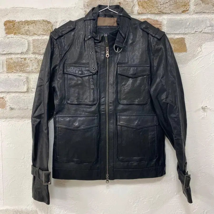 밀리터리 스타일의 블랙 가죽 자켓입니다. 어깨의 에폴렛과 기능적인 포켓 4개가 특징입니다.