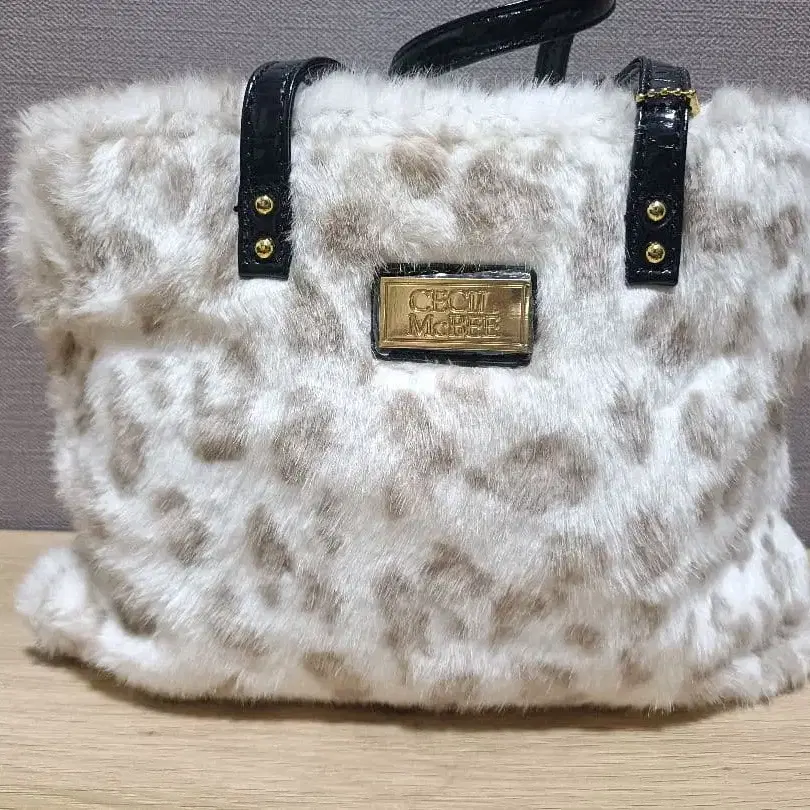 퍼 소재의 화이트 베이지 핸드백, 스톤 장식 포함.