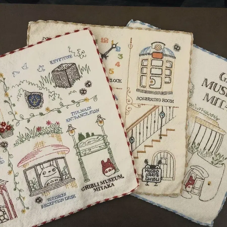 지브리 미술관 자수 핸드 타월 3장 세트 지브리 미술관 내 만마유토에서 구매했습니다. 뒷면의 씰 택은 떼었지만, 미사용입니다. 원단은 면 100%이며, 자수 마감이라 뒷면은 원래 올풀림이 있습니다. 이미지 참조해주세요. 접어서 발송합니다.