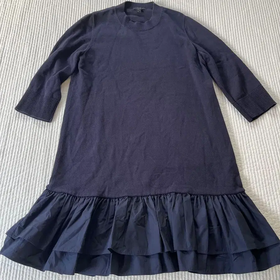 네이비 프릴 니트 원피스, 7부 소매 디자인으로 캐주얼과 포멀 모두에 최적입니다. - 색상: 네이비 - 디자인: 프릴 포함 - 소매: 7부 소매 - 소재: 니트와 원단의 콤비네이션 방문해 주셔서 감사합니다. 사이즈 - M