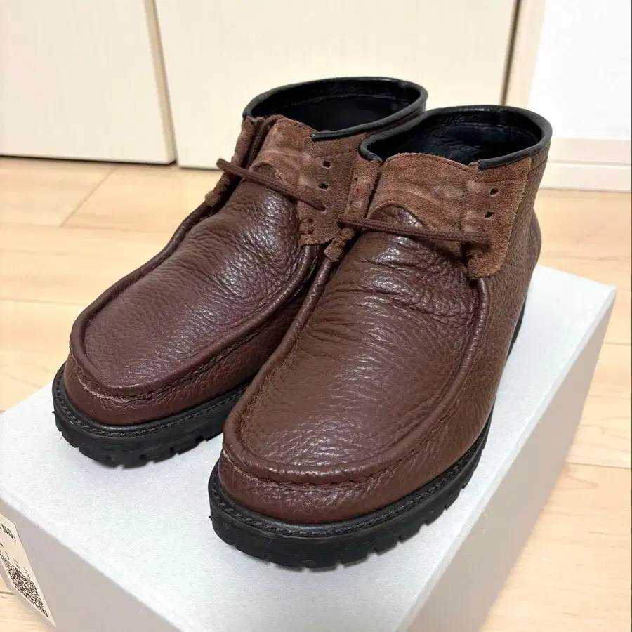 fort general store 별주 넘버 모카신 신발입니다. 사이즈가 맞지 않아 판매합니다. 넘버 스테디셀러인 3홀 디자인으로, 스니커즈 같은 착용감을 선사합니다. 발에 잘 맞으며, 가죽 신발은 좋아하지만 [피곤하다]는 편견을 없애줄 한 켤레입니다. 기존 모델의 스웨이드/크레이프솔에서, 강인한 인상을 주는 주름이 들어간 크롬 무두질의 매우 고급스러운 스테어 가죽을 사용했으며, 밑창은 비브람으로 변경했습니다. 또한, 흠집이나 얼룩이 눈에 잘 띄지 않는 것이 특징으로 튼튼하게 오래 신을 수 있는 가죽을 사용했습니다. 총 2일 정도 착용했습니다. - 색상: 브라운 - 소재: 가죽 - 밑창: 비브람
