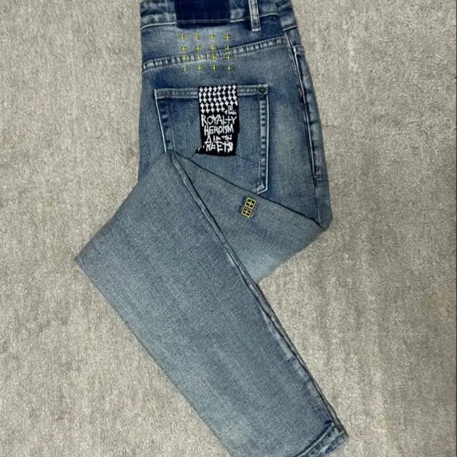 데미지 가공과 자수가 특징인 스키니 데님. - 디자인: 데미지 가공과 자수가 들어간 데님 - 백 포켓 디자인: [ ROYALTY HEROISM AND THE STREETS ] 텍스트 포함 - 핏: 스키니 핏 - 색상: 라이트 블루 - 스타일: 캐주얼 방문해 주셔서 감사합니다. 사이즈 - M