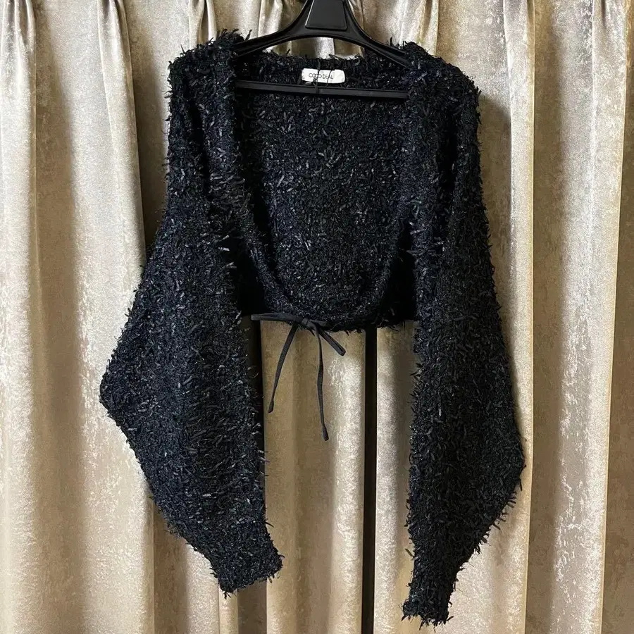 cocodeal의 퍼 느낌 텍스처와 벌룬 슬리브가 특징인 블랙 가디건. - 색상: 블랙 - 소재: 퍼 느낌 텍스처 - 디자인: 오픈 프론트, 리본 포함 - 소매 스타일: 벌룬 슬리브 방문해 주셔서 감사합니다. 사이즈 - L