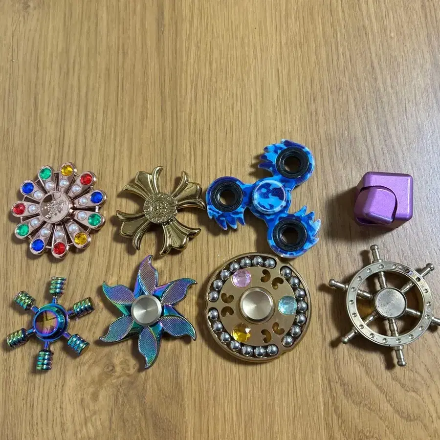 다채로운 디자인의 피젯 스피너 8개 세트.
