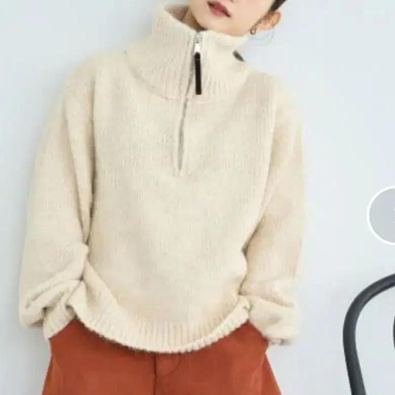 [ 디자인 ] 미들 게이지로 큼직하게 짜인 니트는 보기에도 따뜻하고 가벼운 착용감. 포근한 촉감이 부드럽게 몸을 감싸줍니다. 특징적인 하프 지퍼 디자인의 하이넥은 코디에 따라 분위기를 바꿀 수 있는 것이 매력. 지퍼를 열어 옷깃을 접으면 내추럴 무드의 인상으로, 전부 잠그고 옷깃을 세우면 목까지 따뜻하고 고급스러운 스타일이 완성됩니다. 지퍼 부분에는 은은한 배색 벨로아로 악센트를 주어, 심플함 속에도 위트를 더했습니다. 캐주얼부터 포멀까지, 다양한 스타일에 맞는 다용도 아이템.