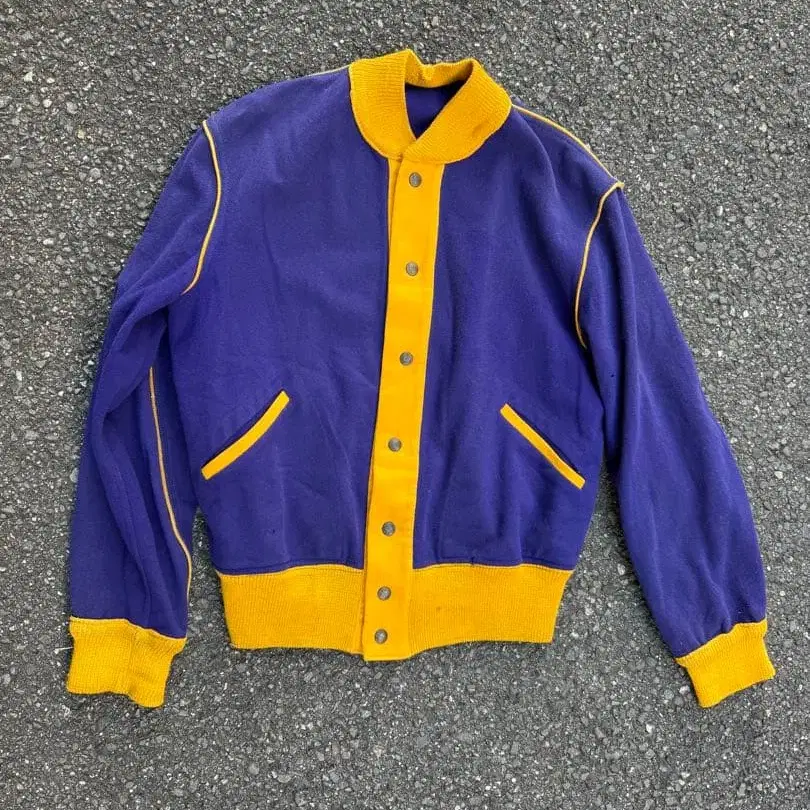 사이즈 - L BUTWIN 50s 울 자켓입니다. 바시티 자켓보다 원단이 약간 얇습니다. 레이커스 색상으로 배색이 좋습니다. 벌레 먹은 곳이 몇 군데 있습니다. 빈티지 상품이므로 이해해 주시면 감사하겠습니다. 어깨 너비 48 가슴 너비 54 기장 64