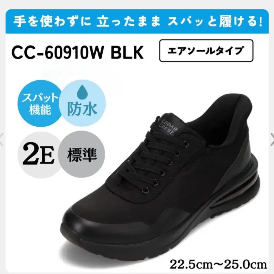 시더 크레스트 핑거프리 슈즈 25cm 여성용 정가 세금 포함 6490엔 ( 현재 세일 대상에서 제외입니다. ) 이번 시즌 구매 후 5회 정도 착용했습니다. 자세히 보면, 예를 들어 오른쪽 발에 사진에서 보시는 것처럼 약간의 주름이나 작은 흠집이 있고, 인솔을 빼면 약간의 얼룩이 있어 새 상품이라고 생각하기 어려울 수도 있지만, 전반적으로는 깨끗하다고 생각합니다. 판매를 위해 클리닝도 했습니다. 참고 사이트 https://kutsu.com/item/243114670.html 핑거프리 슈즈 ( 에어솔 타입 ) 방수 손을 사용하지 않고 신을 수 있는 [ 22.5cm ~ 25.0cm ] ★ (블랙) CC-60910W