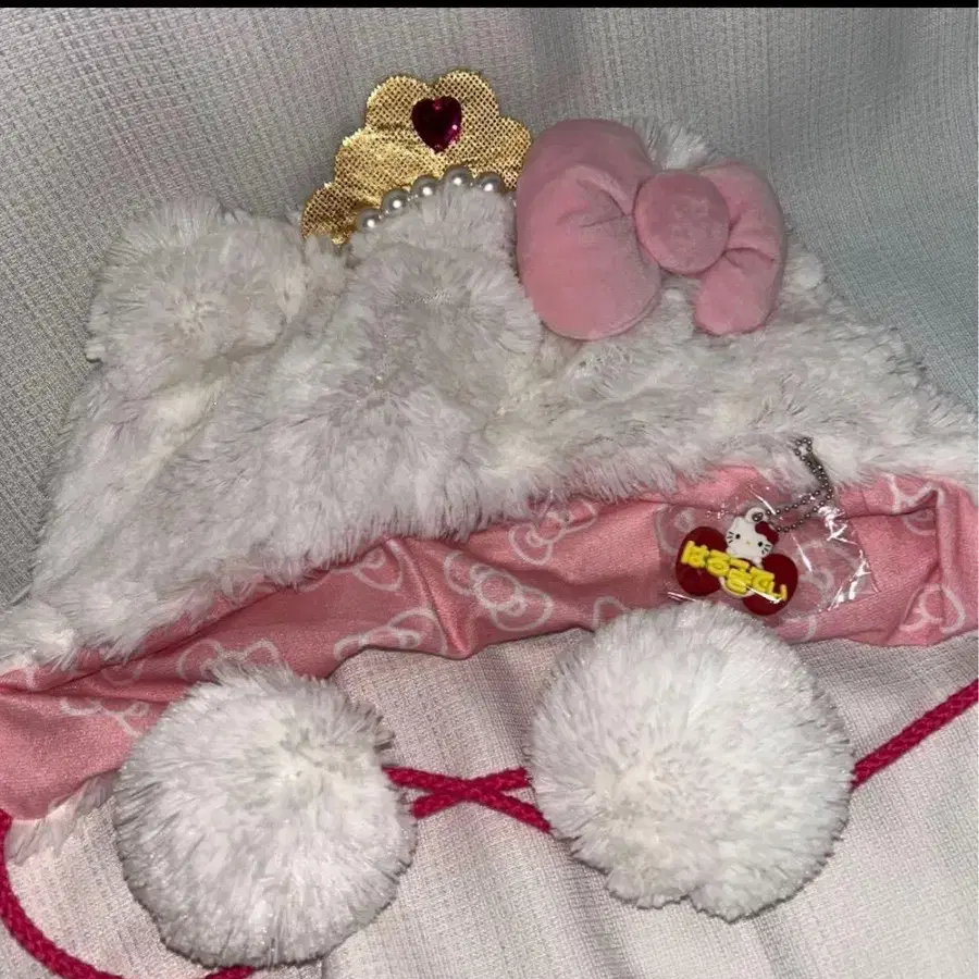 헬로키티 리본 포함 화이트 퍼 니트 모자