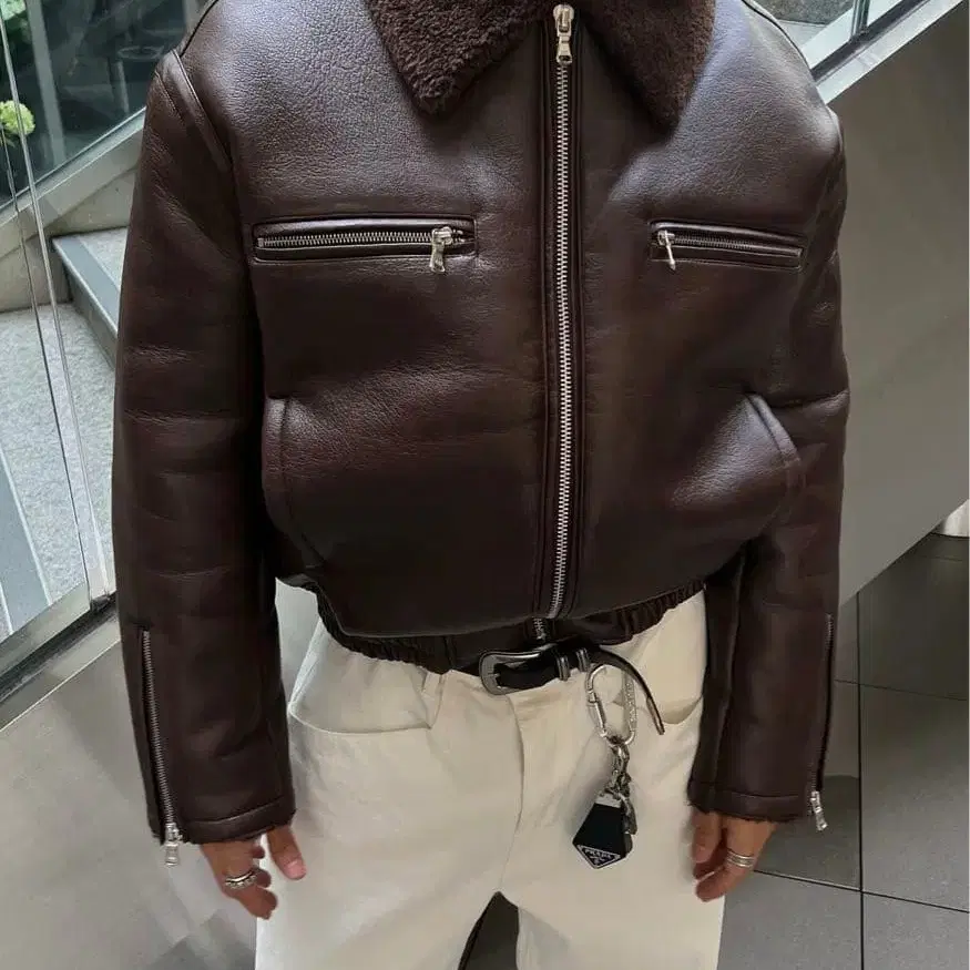 트렌디한 브라운 컬러로, 무스탕 자켓과 가죽 블루종을 조합한 듯한 디자인이 멋진 아이템입니다.