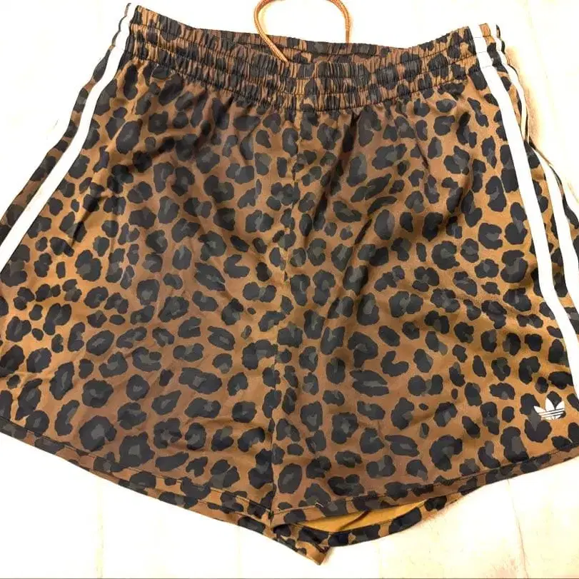 레오파드 무늬 디자인의 adidas 숏팬츠, 사이드에 3개 라인 포함.