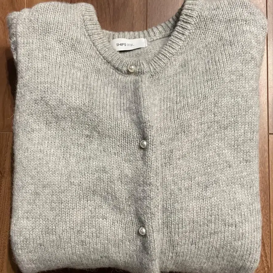 플라켓에 펄라이크 버튼, 소매는 레이스 니트로 만든 귀여운 디자인의 가디건.