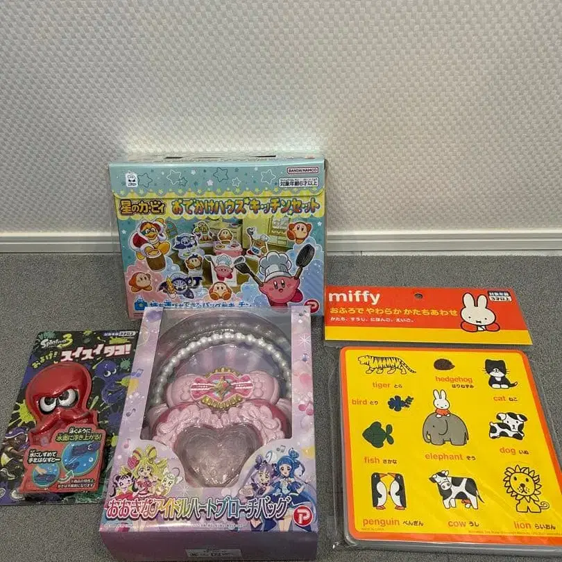 캐릭터 굿즈 만 3세 이상 대상의 미사용 새상품 4세트입니다. - 상품명: 헤엄쳐라! 스이 스이 타코 - 상품명: 미피 목욕탕에서 말랑말랑 모양 맞추기 - 상품명: 커다란 아이돌 하트 브로치 백 - 상품명: 별의 커비 외출 하우스 주방 세트 방문해 주셔서 감사합니다.