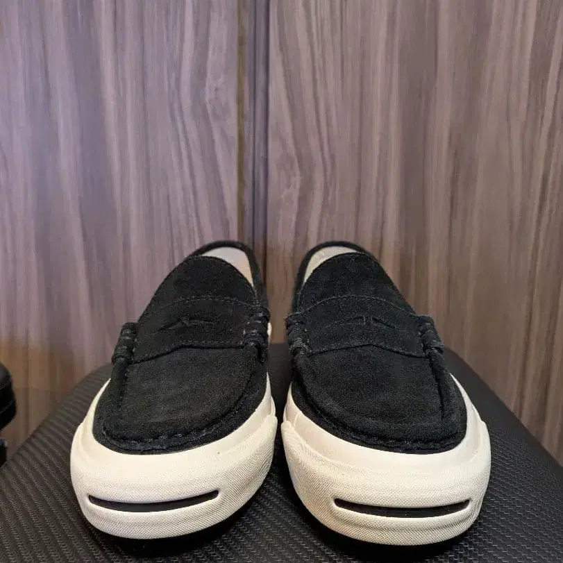 CONVERSE x Graphpaper JACK PURCELL 로퍼 2025년 구매 후, 야외에서 짧게 착용했습니다. 사진에서 보시는 것처럼 상태는 좋다고 생각합니다. 추가 사진 등이 필요하시면 댓글 주시면 업로드하겠습니다. 이하, 공식 소개문 굵은 실로 마감한 U자 형태의 모카신 스티치, 중후한 느낌의 밑창, JACK PURCELL의 상징인 '스마일'을 새긴 토 가드 등 특징적인 디테일을 갖추고 있습니다. 또한, 부드럽고 고급스러운 스웨이드 소재를 사용한 어퍼와 가죽 신발을 연상시키는 내추럴 컬러의 안감을 채용하여, 이제껏 없었던 로퍼 타입의 스니커즈가 완성되었습니다. 최대 특징은 외관뿐만 아니라, 새롭게 개발된 '아나토미컬 라스트'를 채용한 점입니다. 이 라스트의 모양에 맞춘 13mm 인솔 웨지가 장착되어 있으며, 파이버 생크로 발등의 아치를 확실하게 서포트합니다. 오소라이트® ︎ 인솔과 함께 풍부한 쿠션성과 자세의 안정성을 제공하여, 가죽 신발 같은 착용감과 뛰어난 보행성을 실현합니다.