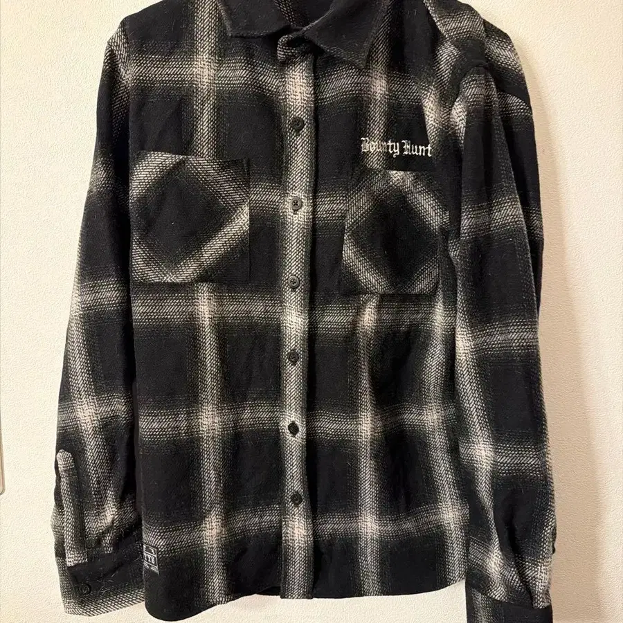 블랙과 화이트 체크 무늬의 플란넬 셔츠, 자수 로고 포함. - 브랜드: Bounty Hunter - 색상: 블랙/화이트 - 스타일: 플란넬 셔츠 - 특징: 자수 로고 방문해 주셔서 감사합니다. 사이즈 - M