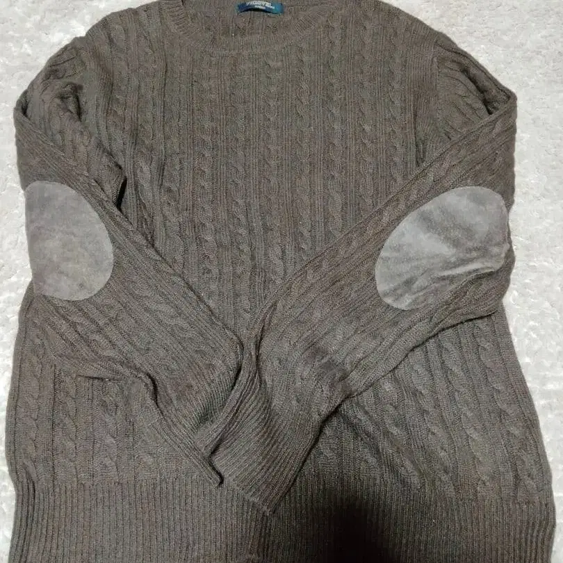 자동 번역되었어요. 원문보기케이블 니트 디자인의 엘보 배치(팔꿈치 패치)가 있는 브라운 스웨터.