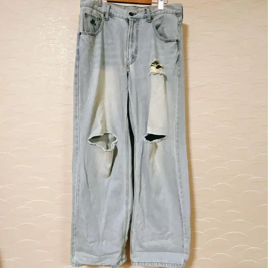 YoungerSong 라이트 블루 데미지 가공이 들어간 와이드 레그 데님 팬츠.