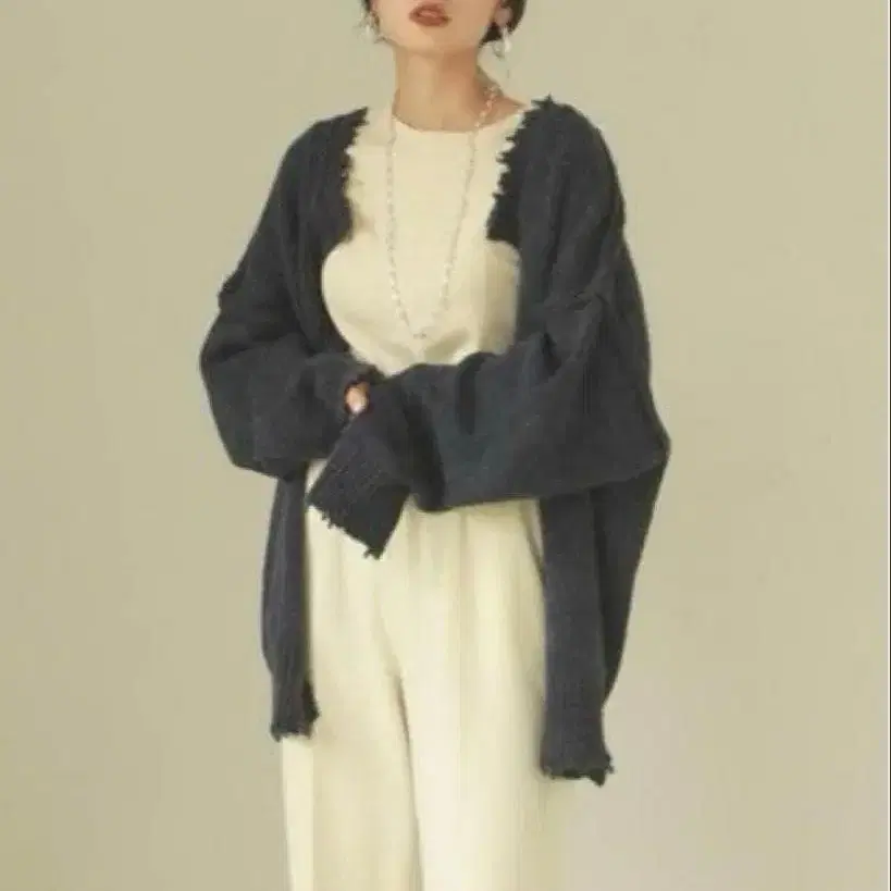 앞뒤 어느 쪽으로도 착용 가능한 디자인의 니트 가디건.