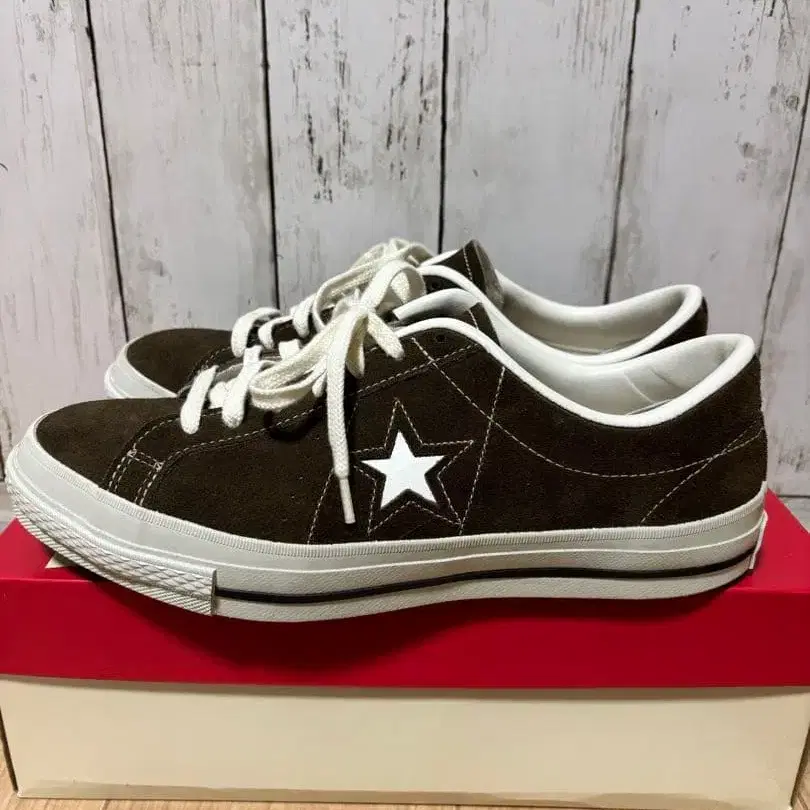 다크 브라운 스웨이드 소재에 화이트 스타 로고가 특징인 스니커즈.