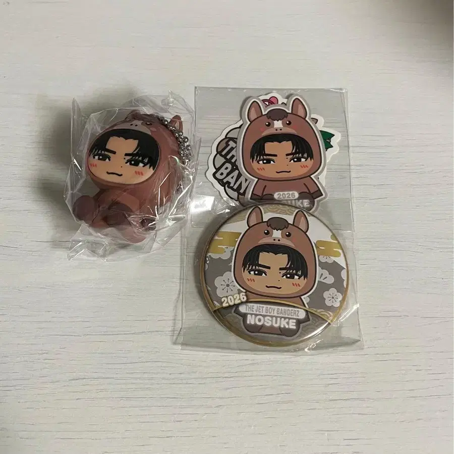 자동 번역되었어요. 원문보기THE JET BOY BANGERZ 2026 NEW YEAR CAPSULE NOSUKE (캔뱃지, 스티커) & 인형옷 키링 (노멀) 각 1점씩의 3세트