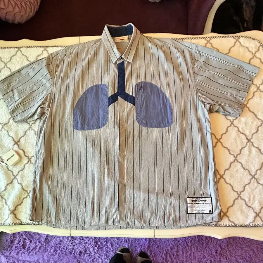 스트라이프 디자인에 독특한 폐 프린트가 들어간 반팔 셔츠.