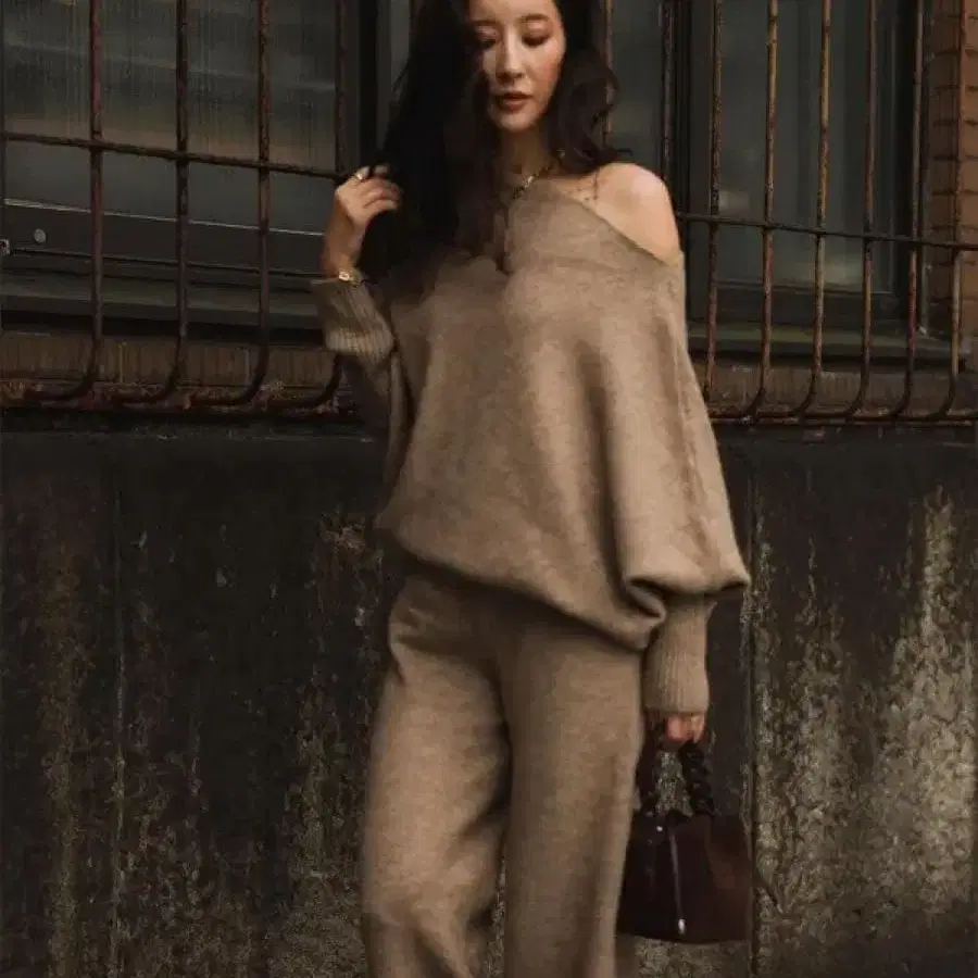 오프숄더 베이지 니트 셋업