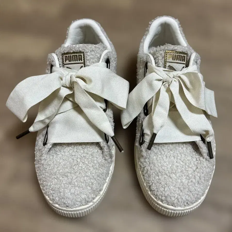 PUMA 화이트 퍼 스니커즈 리본 포함 23.5cm