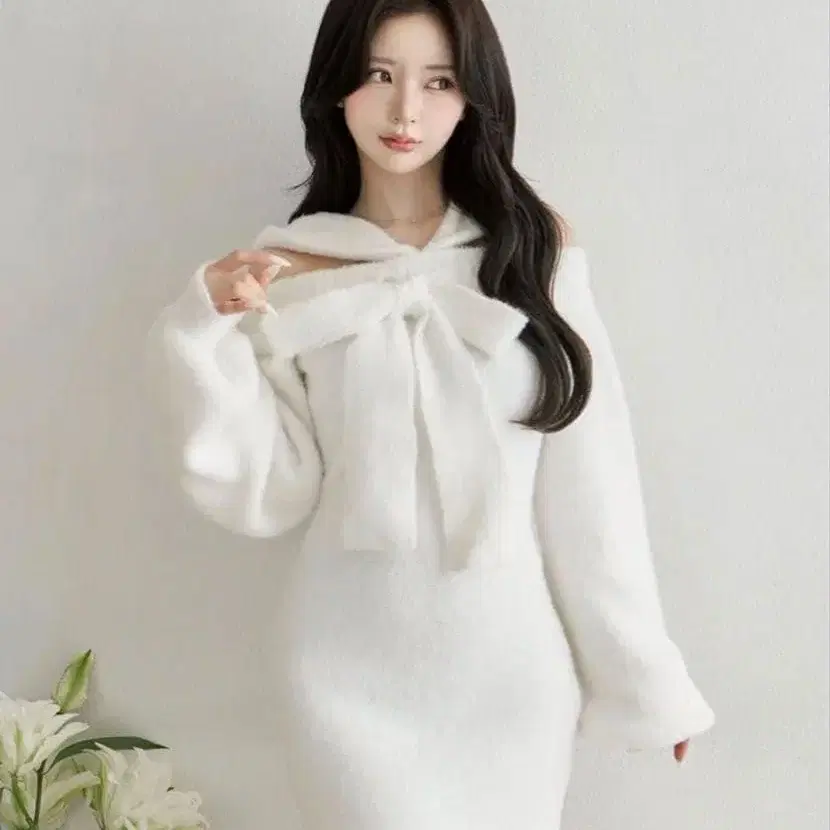 다리치 후디 오프숄더 니트 미니 원피스 화이트