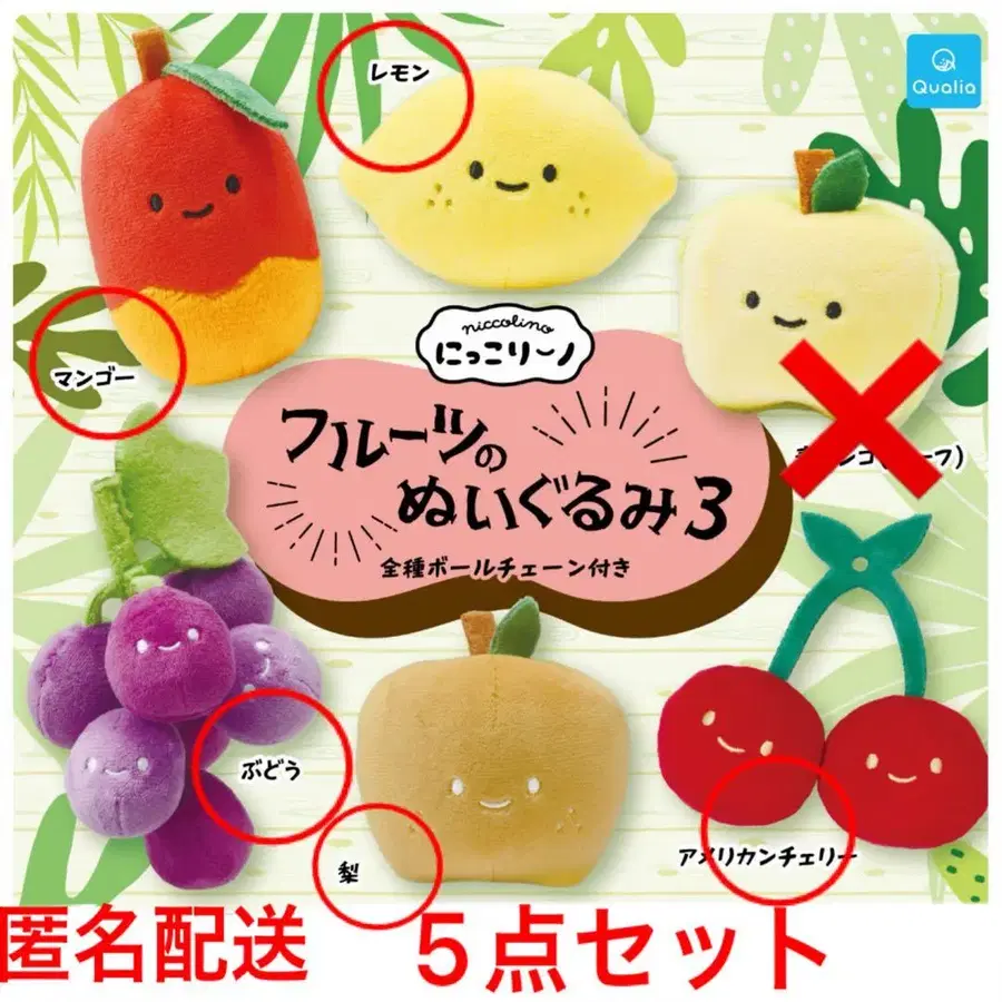 Qualia(퀄리아) 닛코리-노 과일 봉제 인형 3 5종 세트 ● 포도 ● 배 ● 망고 ● 레몬 ● 아메리칸 체리 미개봉 새상품 캡슐, 리플렛 없음 ⭕️ 댓글 없음 즉시 구매 환영 ♪ ❌ 가격 인하 낱개 판매 불가 침수 방지하여 정성껏 포장하여 유패킷 포스트로 발송해 드리니 잘 부탁드립니다. 또한 새상품이므로, 초기 불량은 고객님께서 직접 제조사에 문의 부탁드립니다.