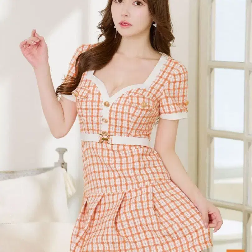 오렌지 체크 무늬의 핏앤플레어 스타일 드레스.